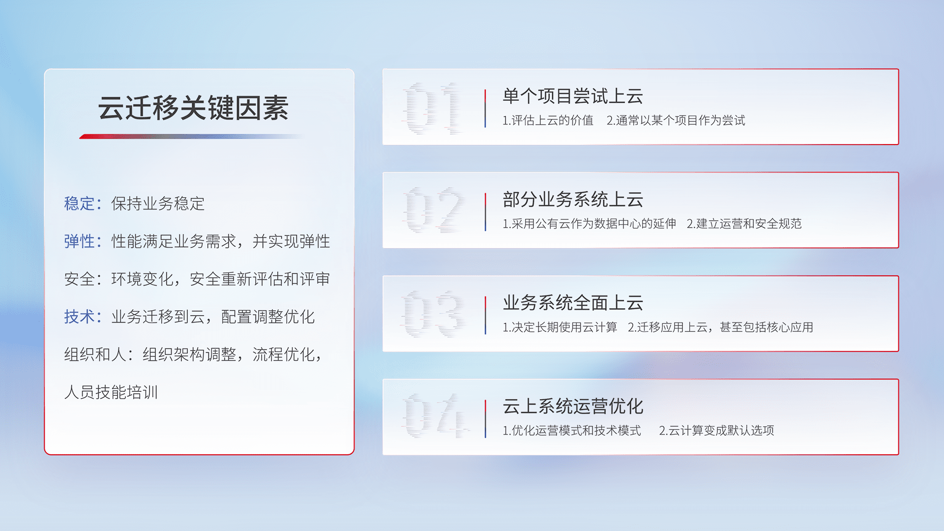结合实际业务,,从规划设计、、、云平台选型、、、云原生改造、、、、数据迁移、、、集成交付,,迁移全过程为客户识别最佳上云路径,,,做好风险识别管理,,,,设计网络架构、、、、身份权限、、、安全审计合规、、操作审计、、、日志审计、、、监控告警策略、、、、多站点容灾设计等,,对云上基础设施进行整体规划,,,,提升IT治理水平,,,以满足弹性、、、高可用、、、高性能的需求。。。